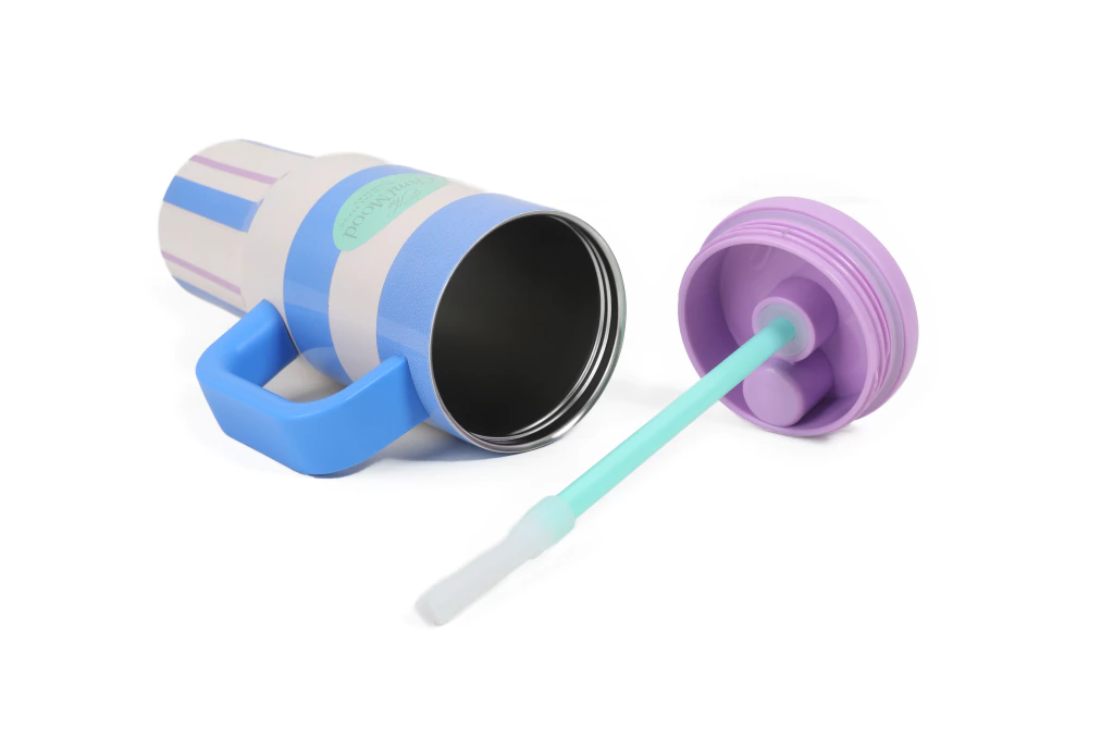 Vaso térmico con manija y sorbete. Interior: acero inoxidable 304 (grado alimenticio). Exterior: impresión full color. Tapa: PP con cierre a presión. Sorbete: reutilizable, de plástico rígido. Manija lateral ergonómica para fácil agarre. Estampado full color con rayas. Aislamiento térmico: mantiene bebidas frías o calientes por varias horas. No apto para microondas ni lavavajillas.