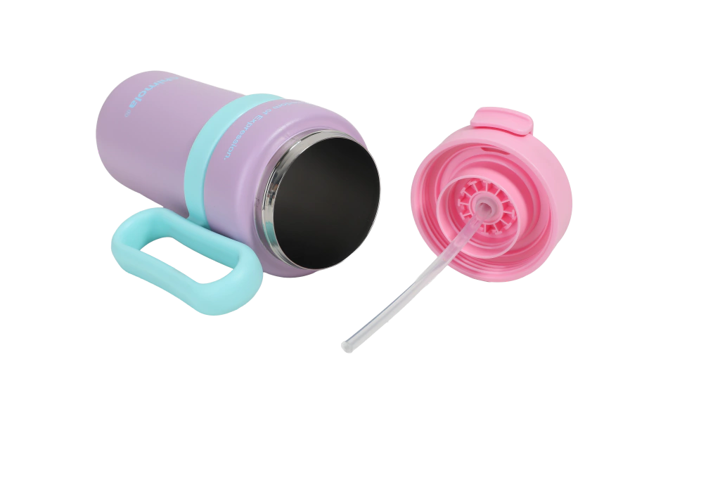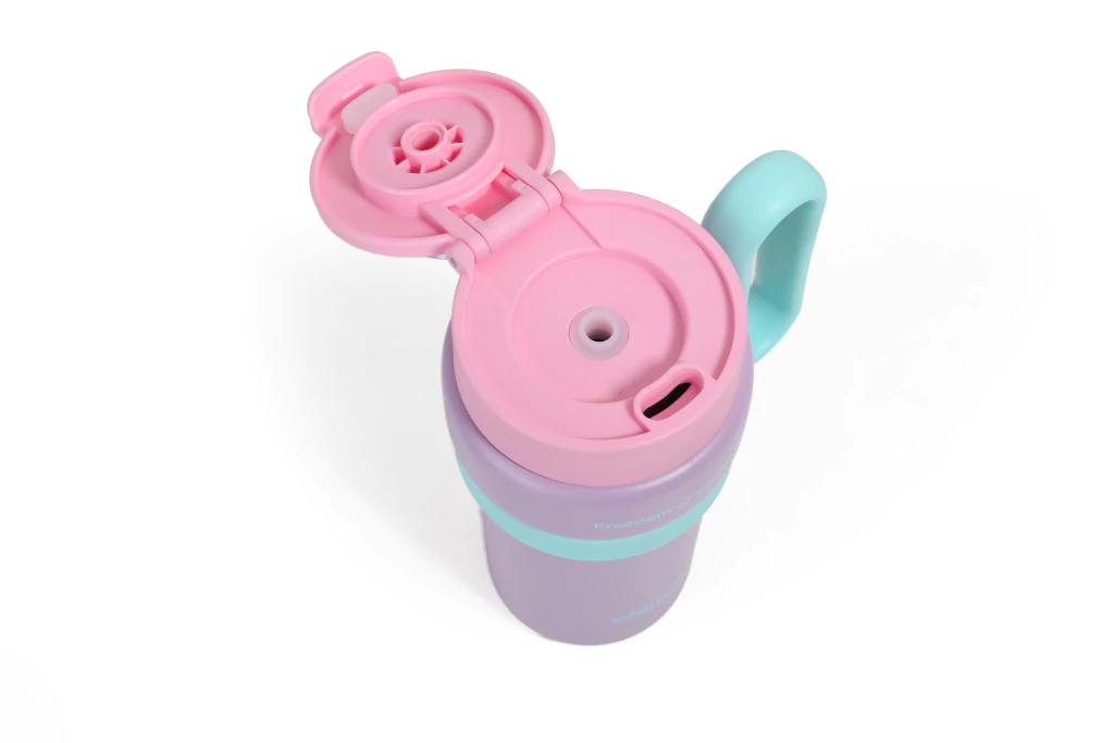 Vaso térmico con manija lateral y tapa abatible. Cuerpo: plástico PP resistente, libre de BPA. Tapa: PP con cierre abatible y traba de seguridad.Boquilla interior de silicona. Incluye manija lateral ergonómica para un agarre cómodo. Ideal para bebidas frías o calientes (hasta 60 °C). No apto para microondas ni lavavajillas.