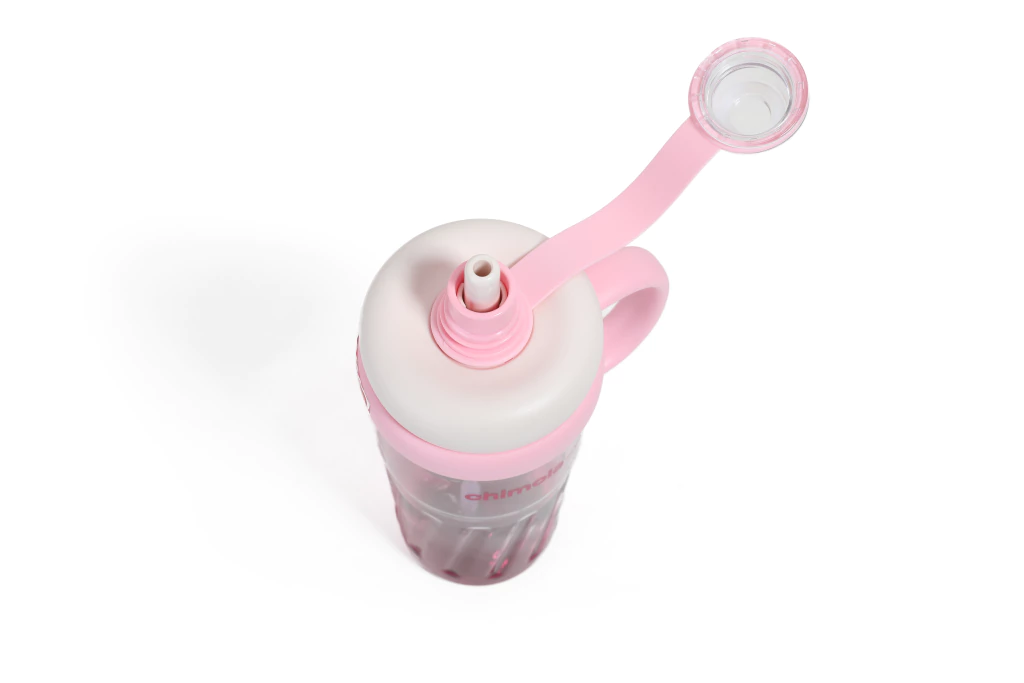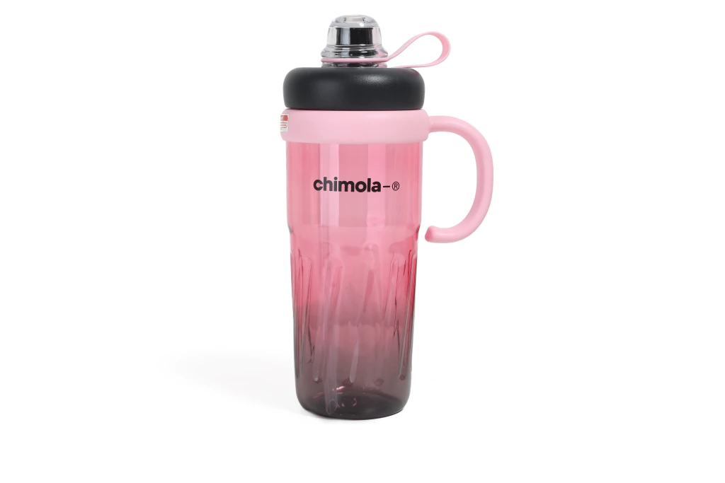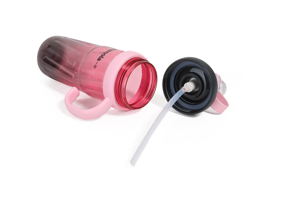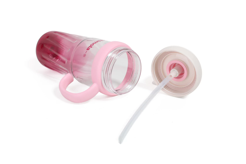 Botella plástica con manija, tapa rosca y boquilla con válvula. Cuerpo: plástico AS transparente con efecto degradé, libre de BPA. Tapa: PP con rosca y boquilla de silicona con válvula antiderrame. Manija lateral ergonómica para mayor comodidad. Tapa con loop flexible para transportar o colgar fácilmente. Apta para bebidas frías o a temperatura ambiente (no calientes). No apta para microondas ni lavavajillas.